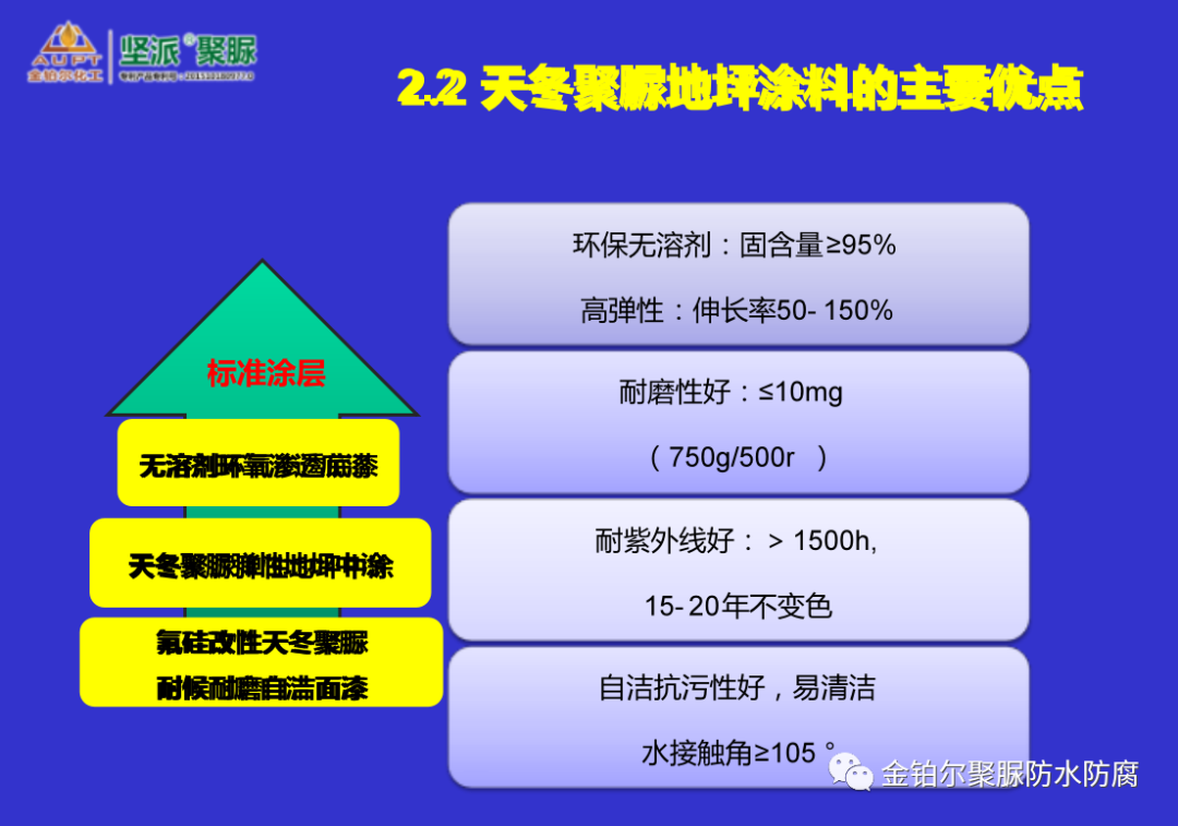 氟硅改性天冬聚脲被稱為第四代聚脲,具有環(huán)保無溶劑、超耐磨、超耐紫外線、高彈性、自潔抗污等功能,如果做為地坪材料使用,其使用壽命可以超過二十年以上,是當(dāng)前綜合性能優(yōu)異的地坪材料之一,也是當(dāng)前頗具發(fā)展?jié)摿Φ牡仄翰牧稀.a(chǎn)品已成功應(yīng)用于水上樂園、工業(yè)地坪、冷庫地坪、養(yǎng)殖場地坪、室外地坪、地下停車場、艦艇甲板等諸多應(yīng)用領(lǐng)域。