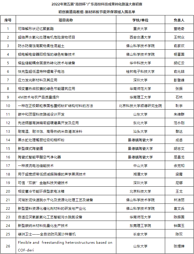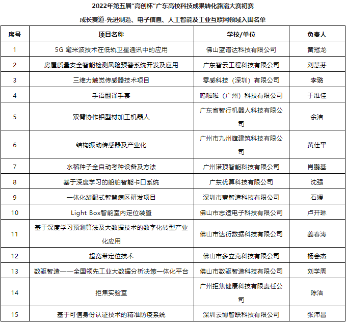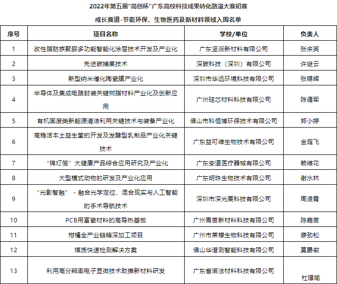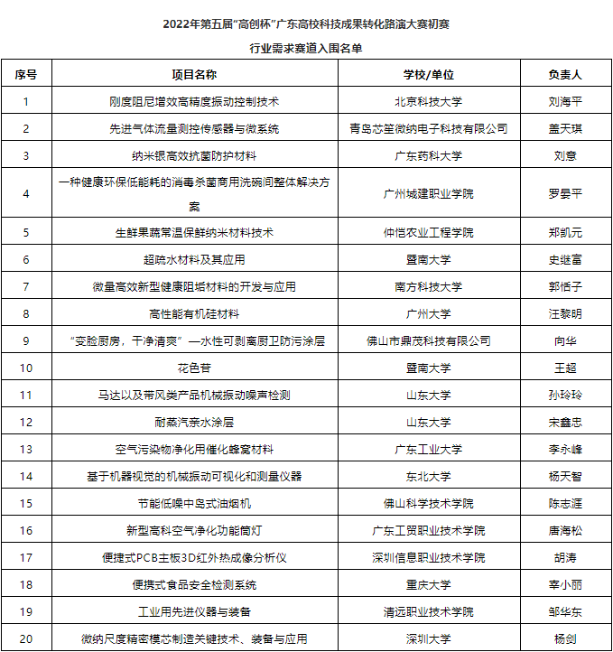 以下為2022年第五屆“高創(chuàng)杯”廣東高校科技成果轉(zhuǎn)化路演大賽入圍初賽項(xiàng)目名單